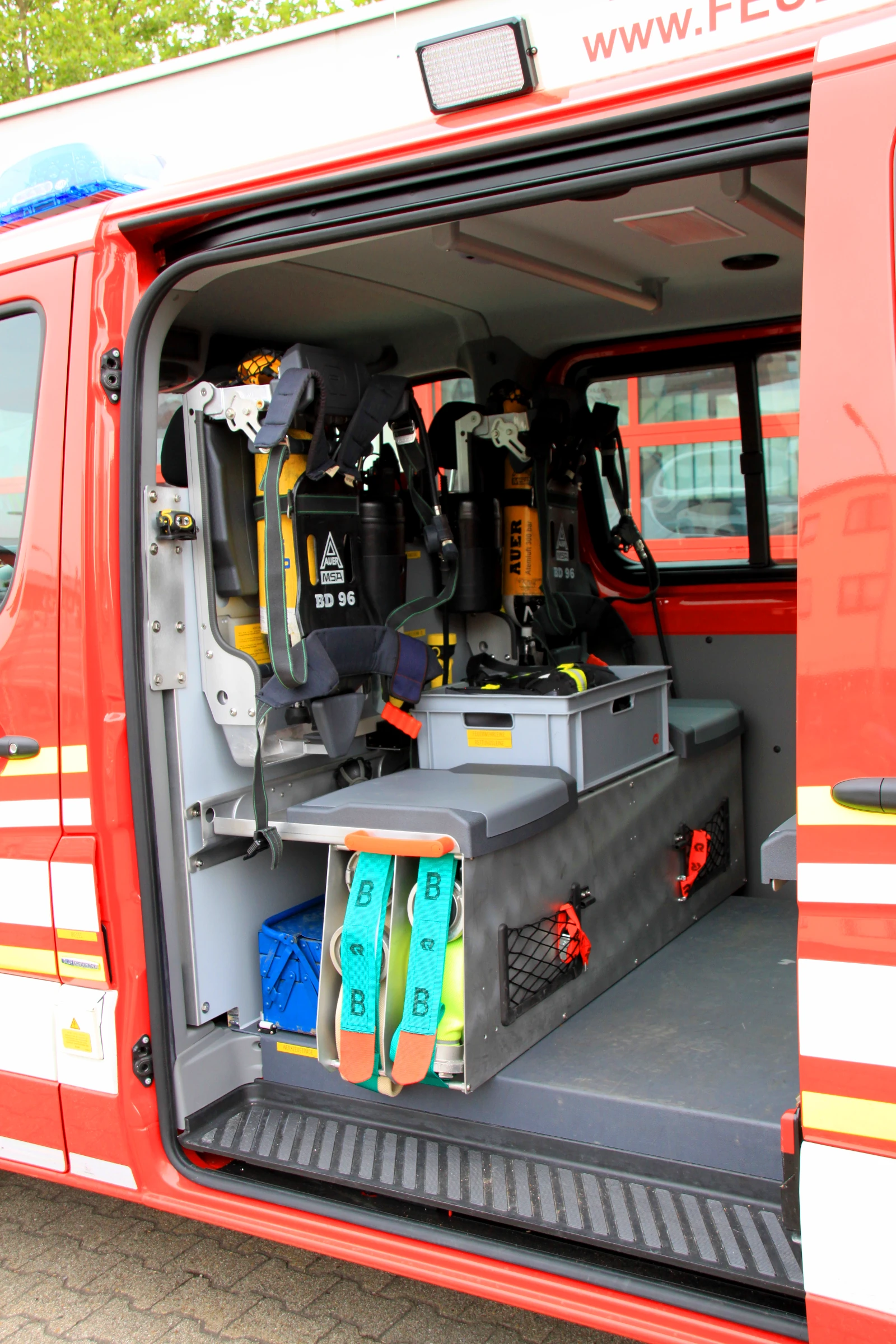 Ausstattung: - 4 Atemschutzgeräte, davon 2 im Mannschaftsraum während der Fahrt anlegbar |